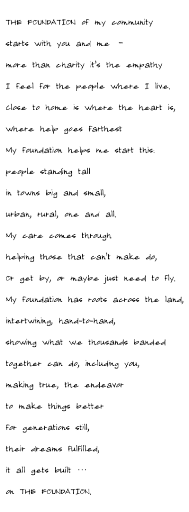 The community foundation anthem was first developed in 2013 as part of a national campaign to bring awareness to the work and impact of community foundations from coast to coast to coast.