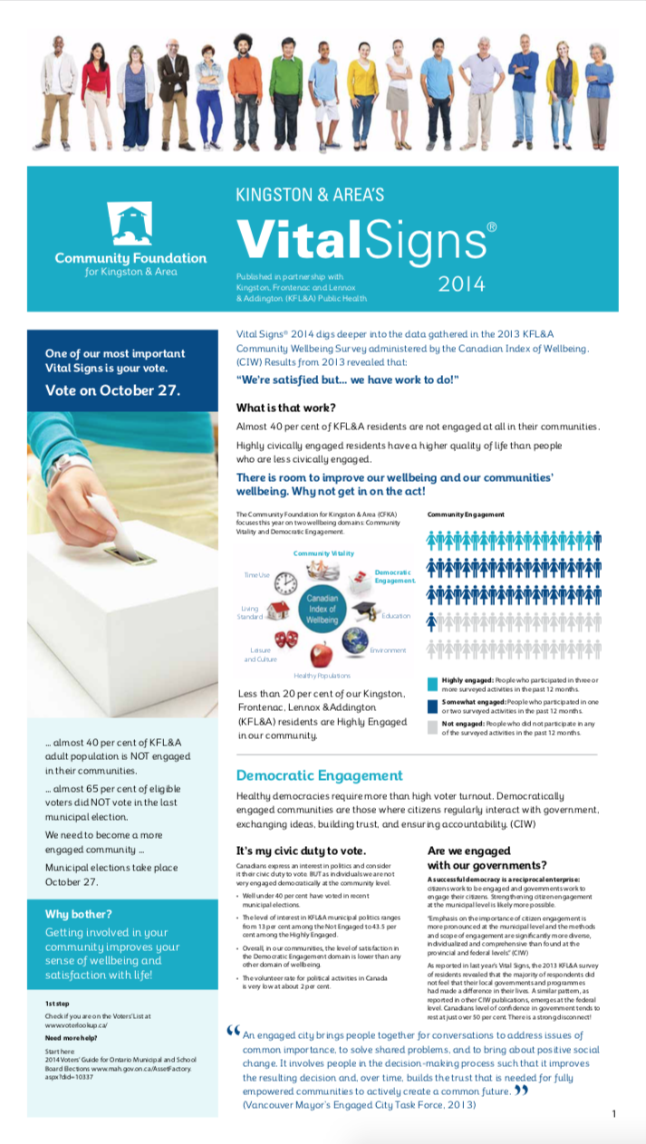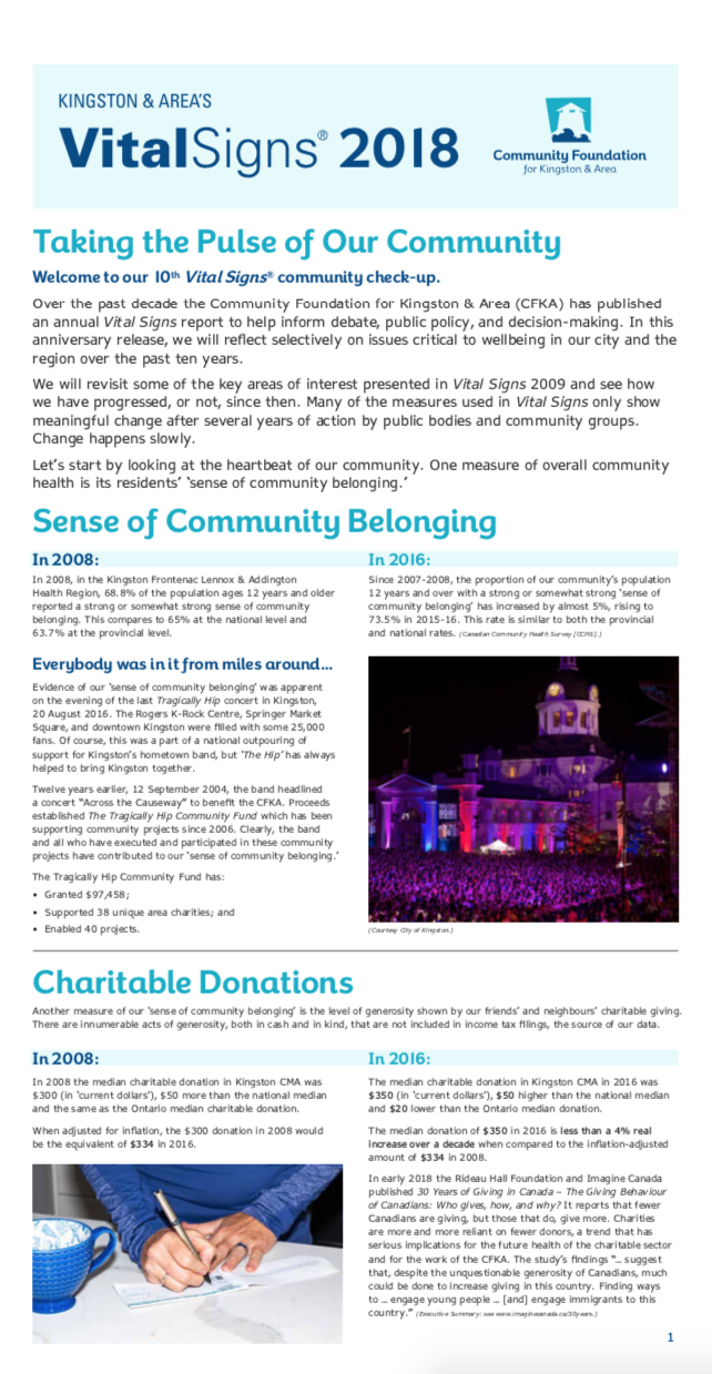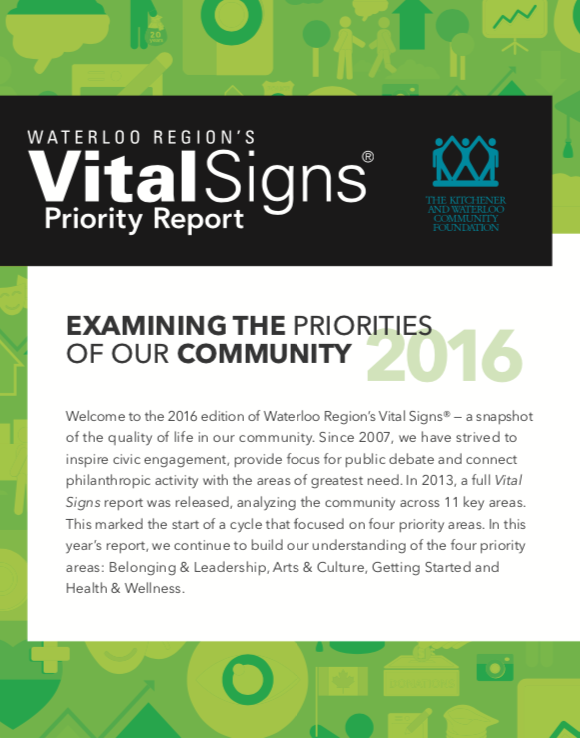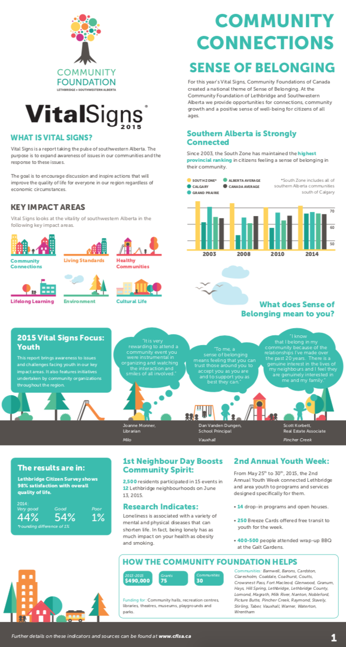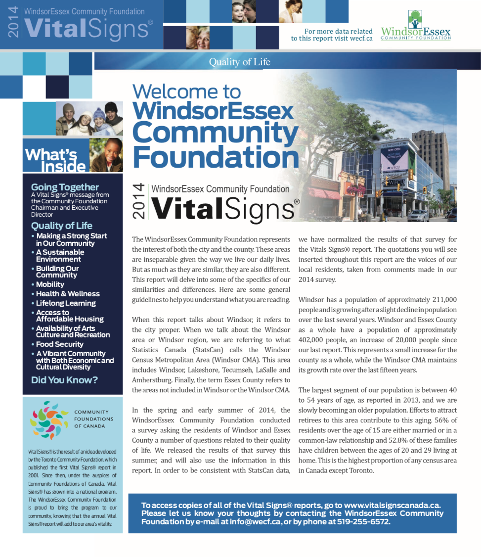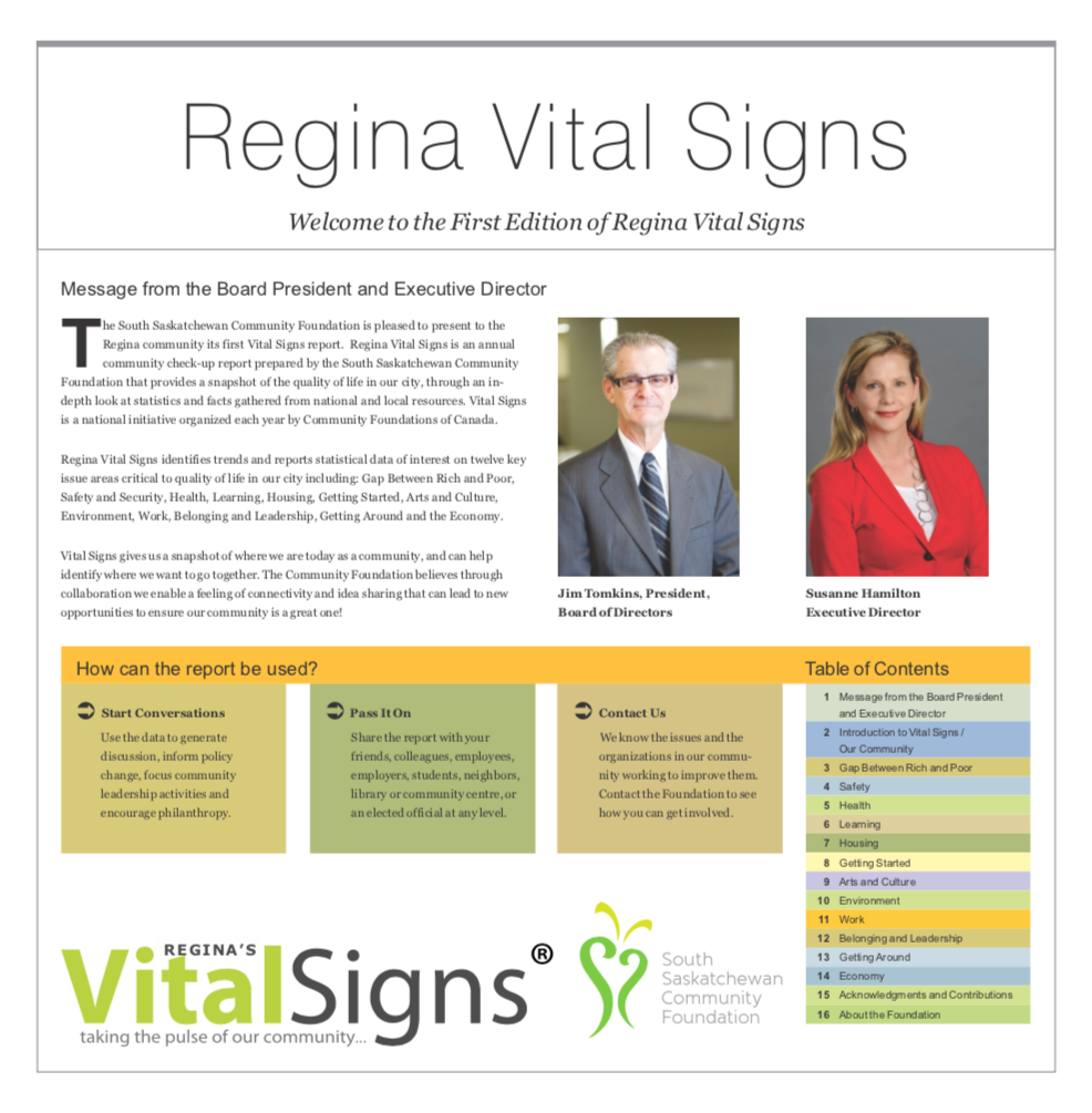 The Vital Signs program has a rich history at CFC, in communities across the country and around the world. Past community reports provide important historical data for many researchers, analysts and organizations. National reports have examined themes and trends as wide-ranging as food security, issues and barriers facing youth in Canada or how the arts and sports play a role in fostering a sense of belonging. Community and international reports examine vital community issues.