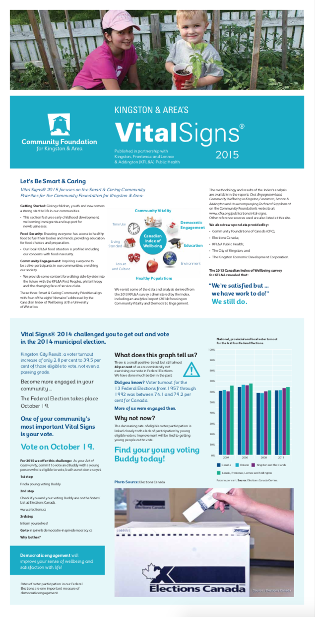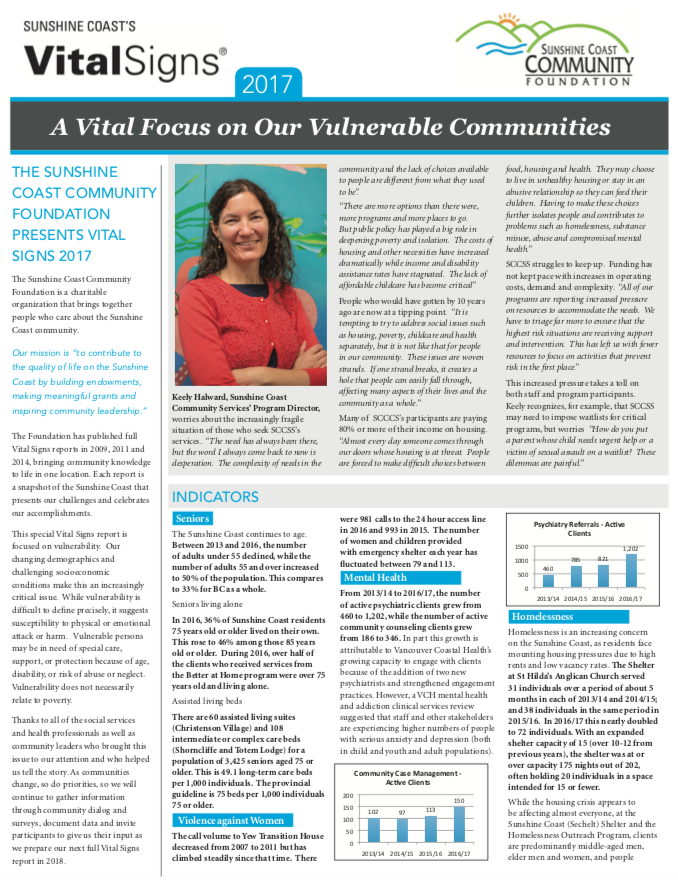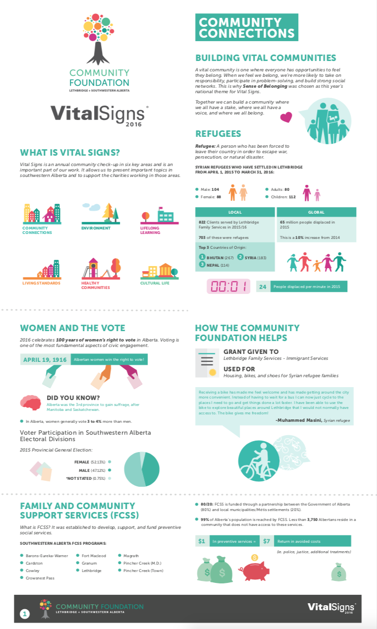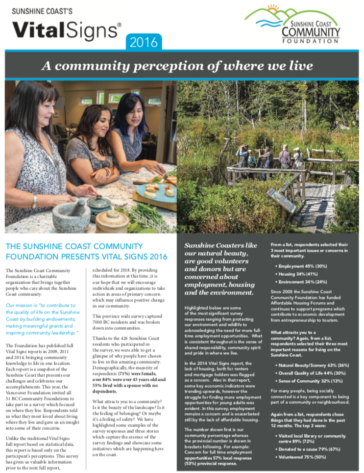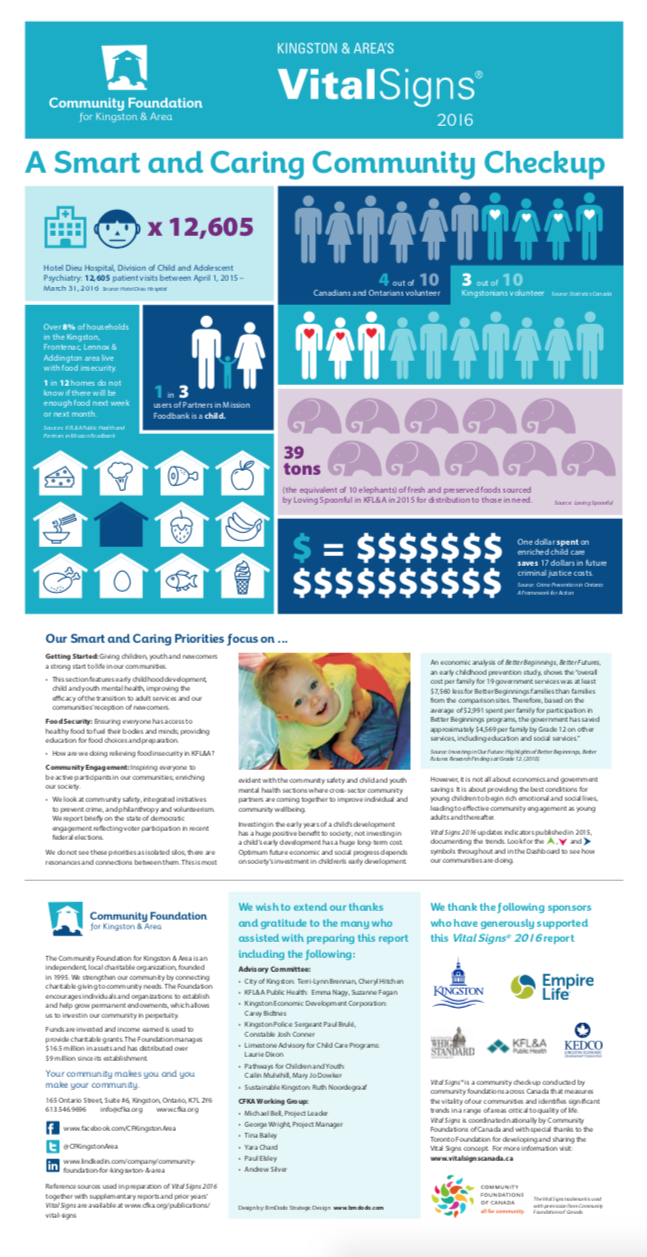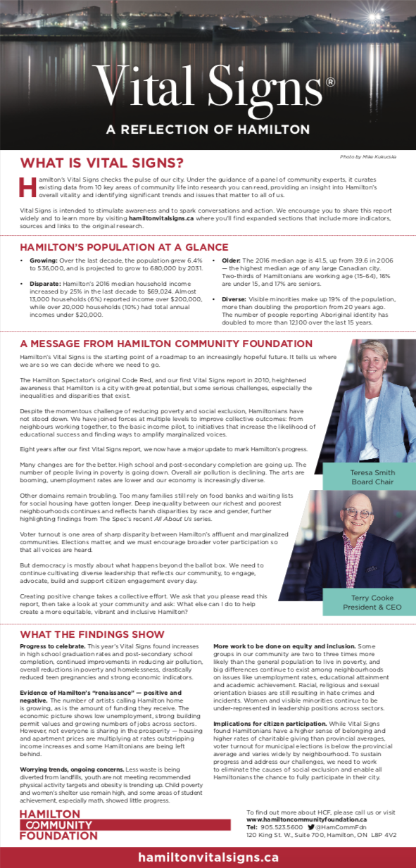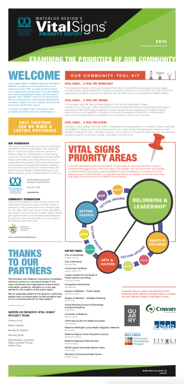 The Vital Signs program has a rich history at CFC, in communities across the country and around the world. Past community reports provide important historical data for many researchers, analysts and organizations. National reports have examined themes and trends as wide-ranging as food security, issues and barriers facing youth in Canada or how the arts and sports play a role in fostering a sense of belonging. Community and international reports examine vital community issues.